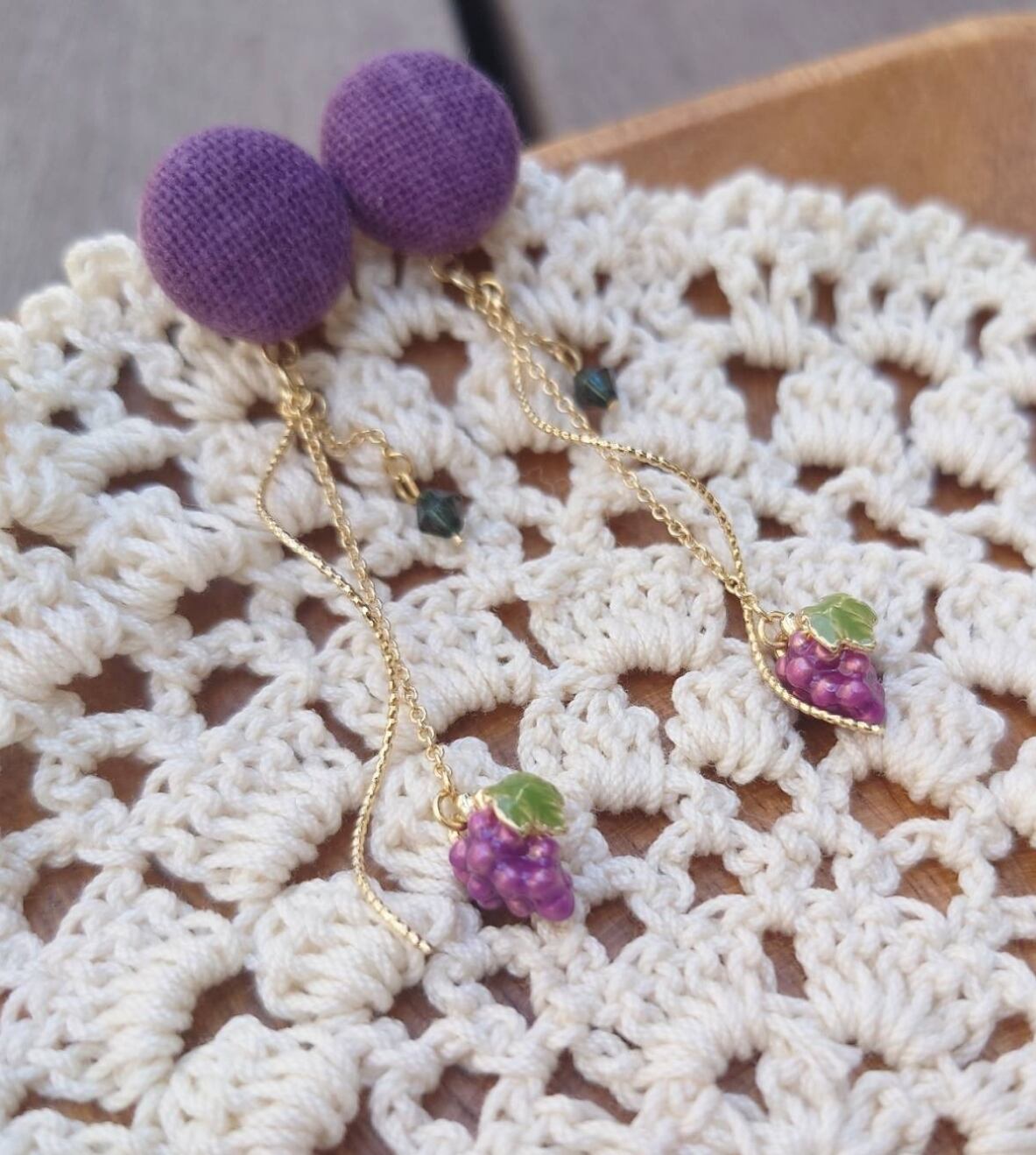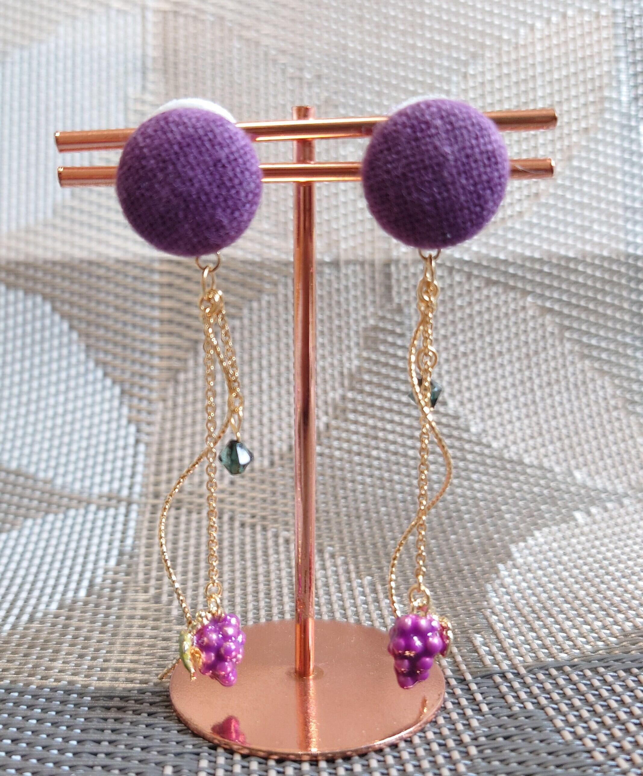手捺染・紫色の生地をくるみボタンにして、長いチェーンとスイングにぶどうを合わせました。