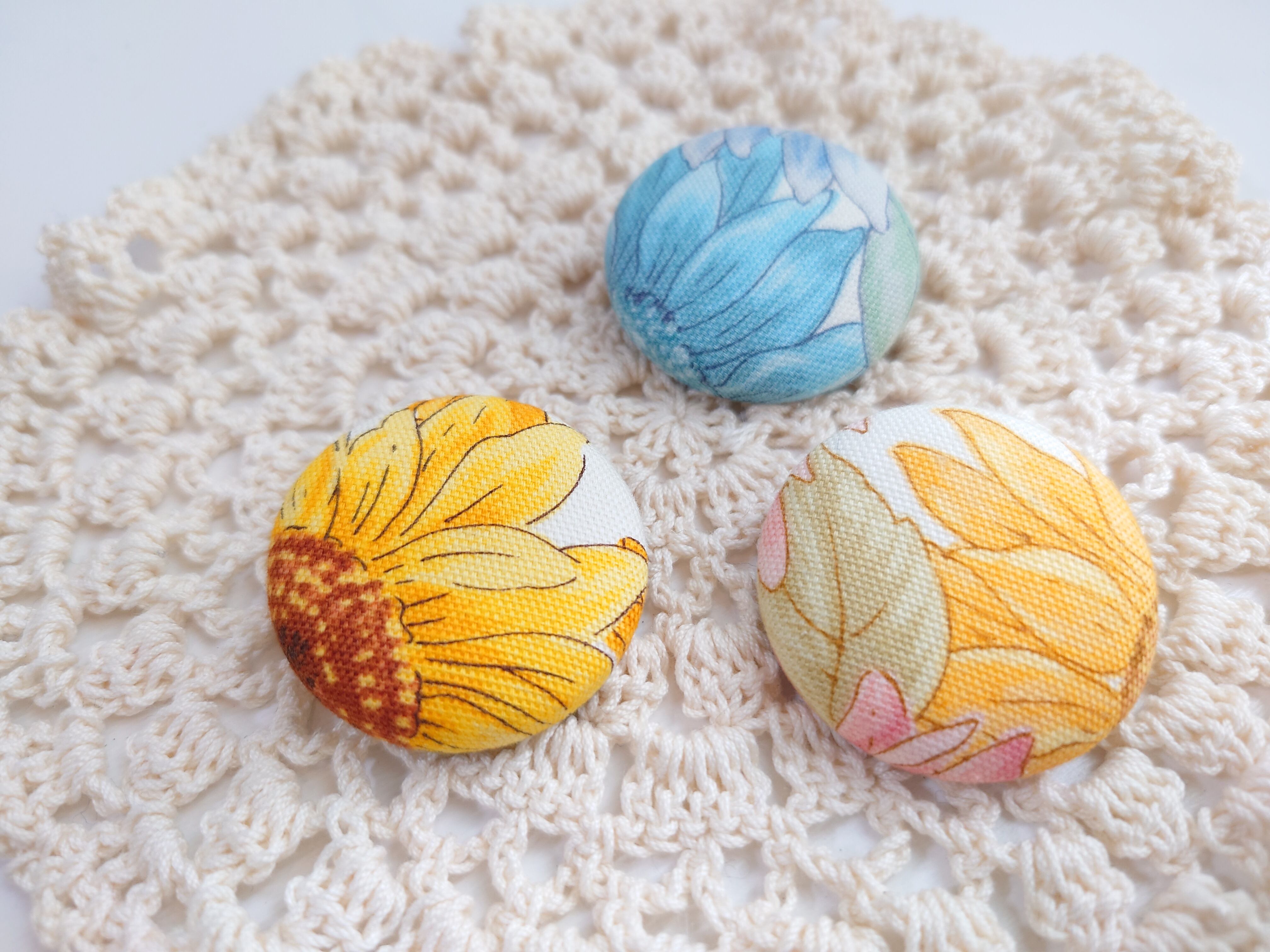 ひまわりの生地でくるみボタンの帯留めを作りました!