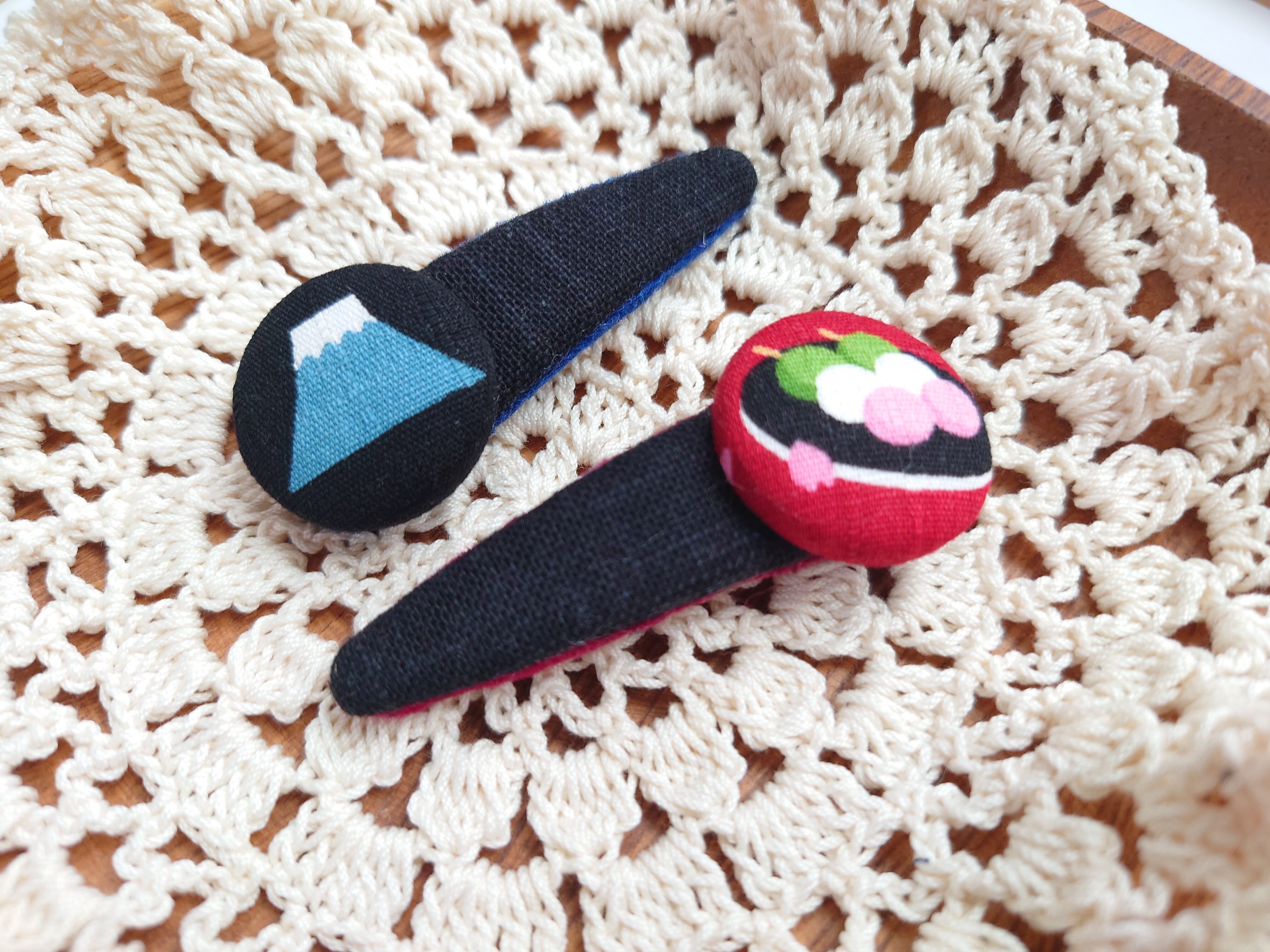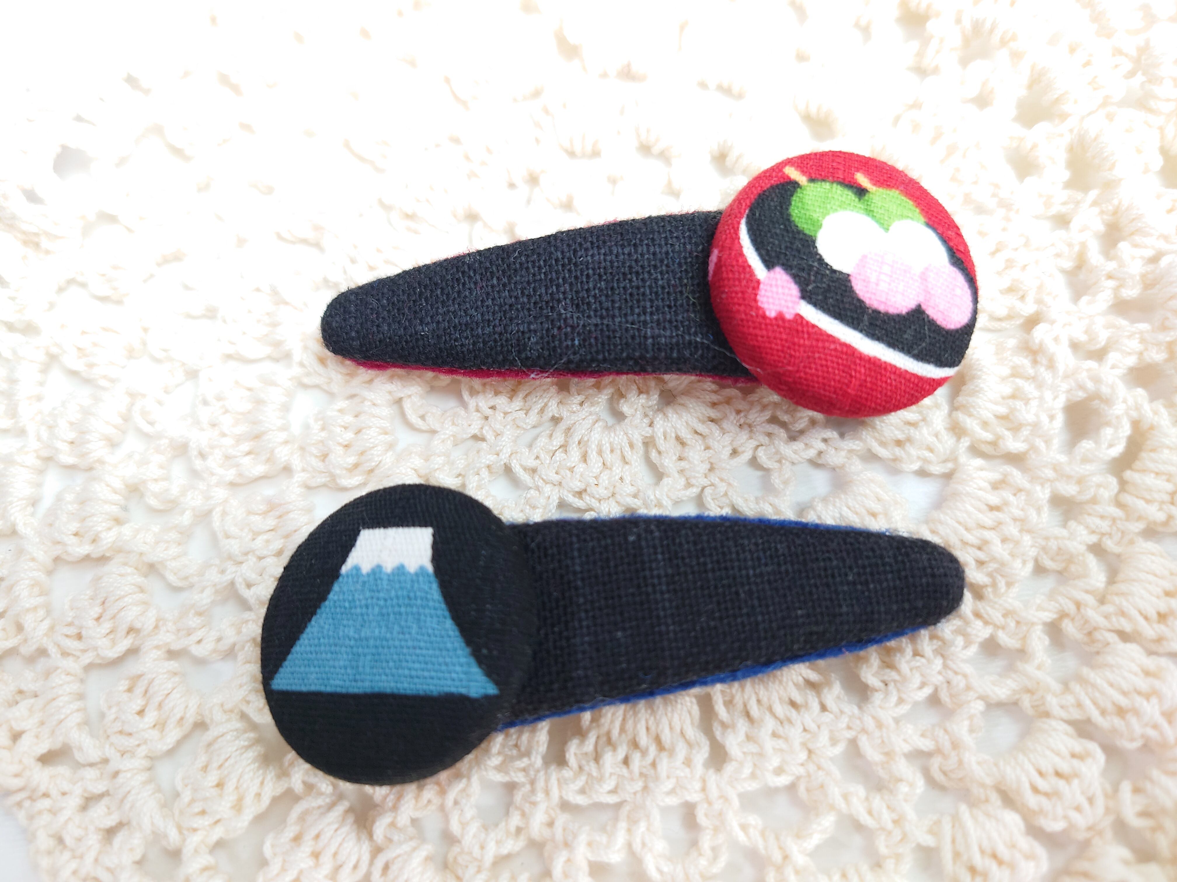 目を引く富士山柄とお団子柄の22mmくるみボタンをアクセントにした7cmのヘアピンです!