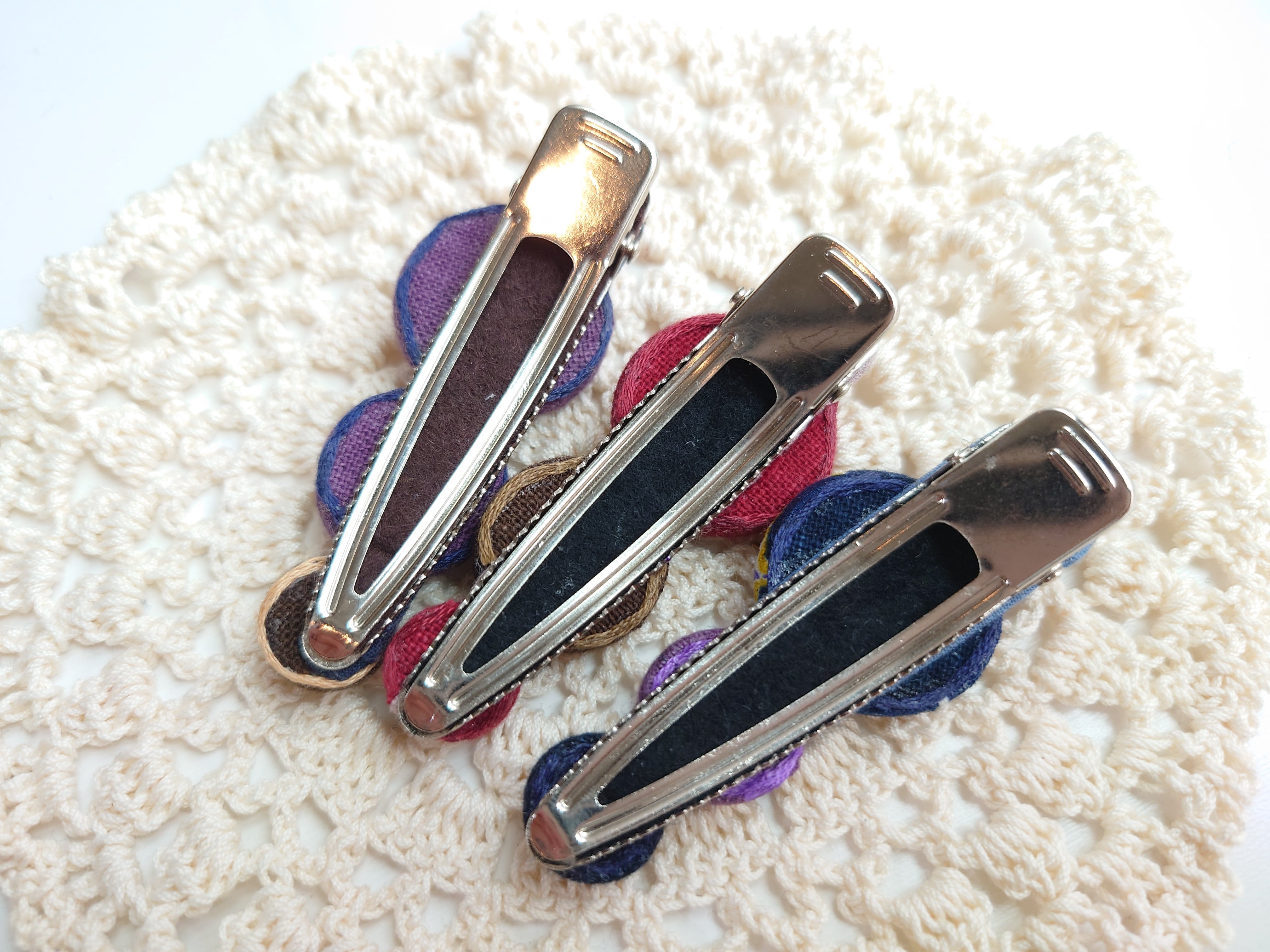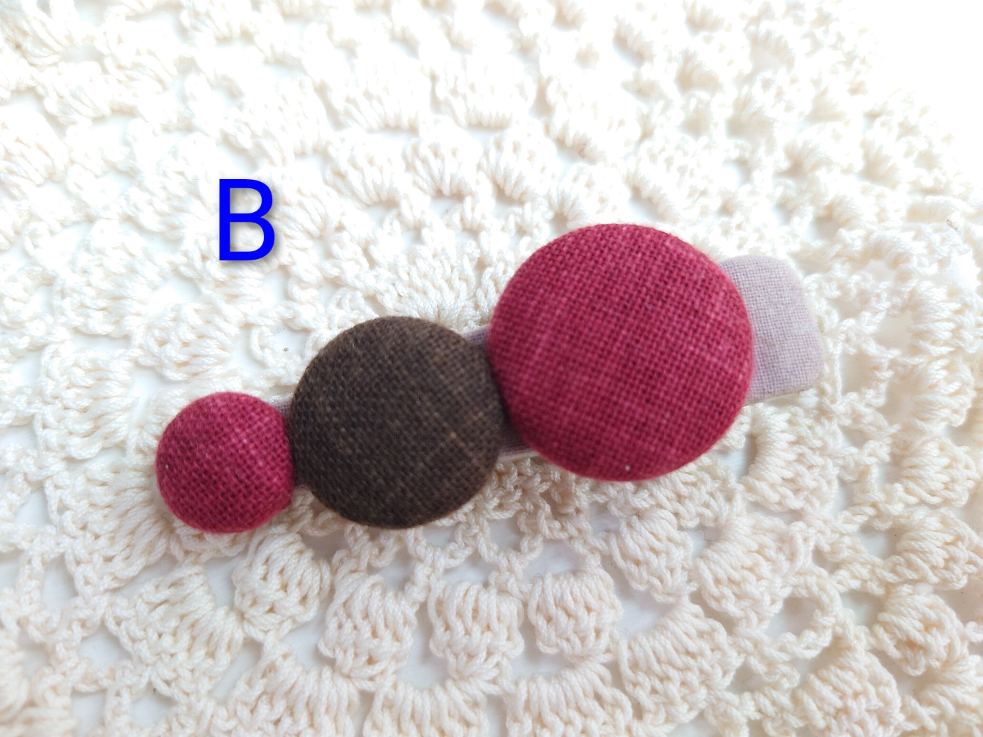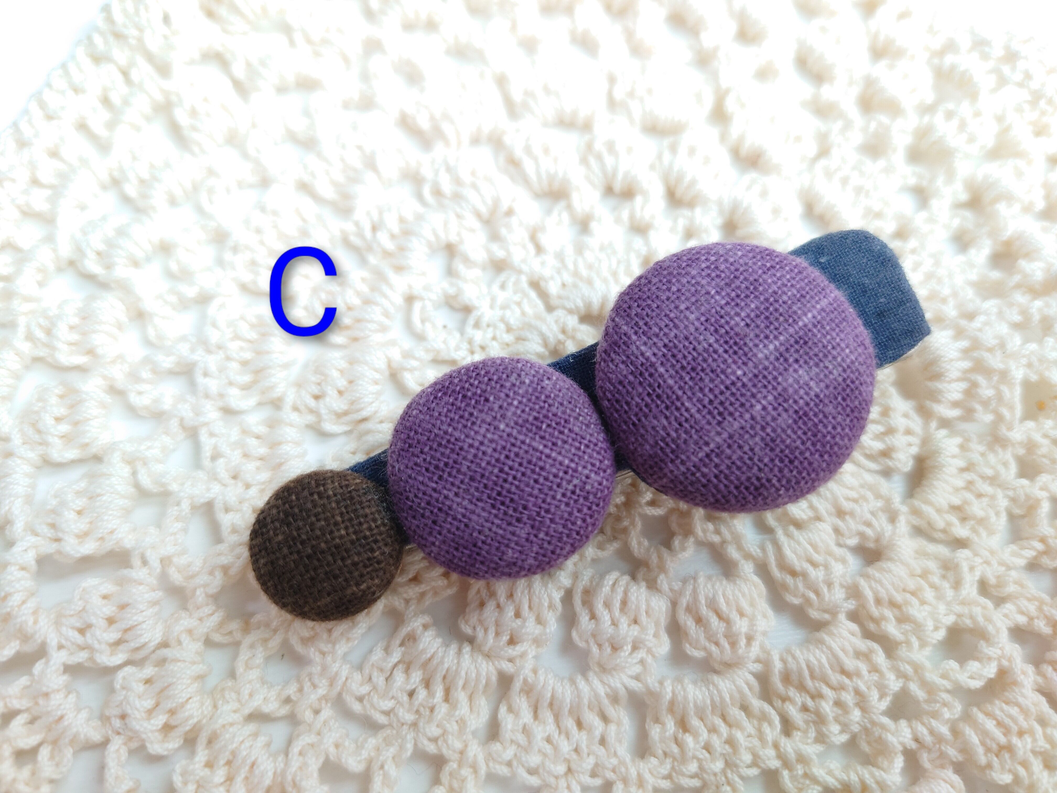 大きさの違うくるみボタンを3つ並べたヘアクリップ。