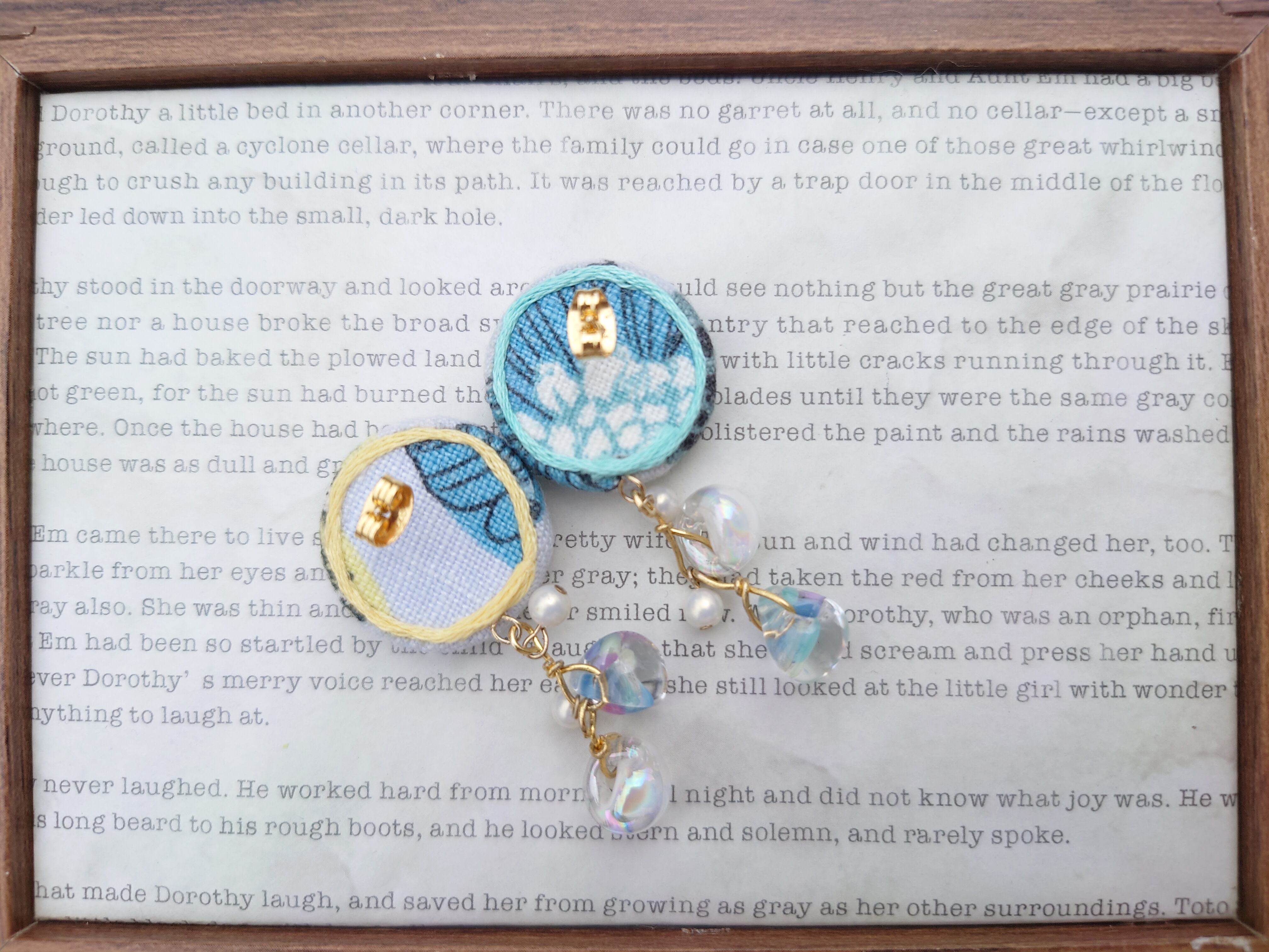 裏までかわいい♪ 22mmくるみぼたんピアス ドロップビーズ 【みずいろお花 きいろのお花】(サージカルステンレス)
