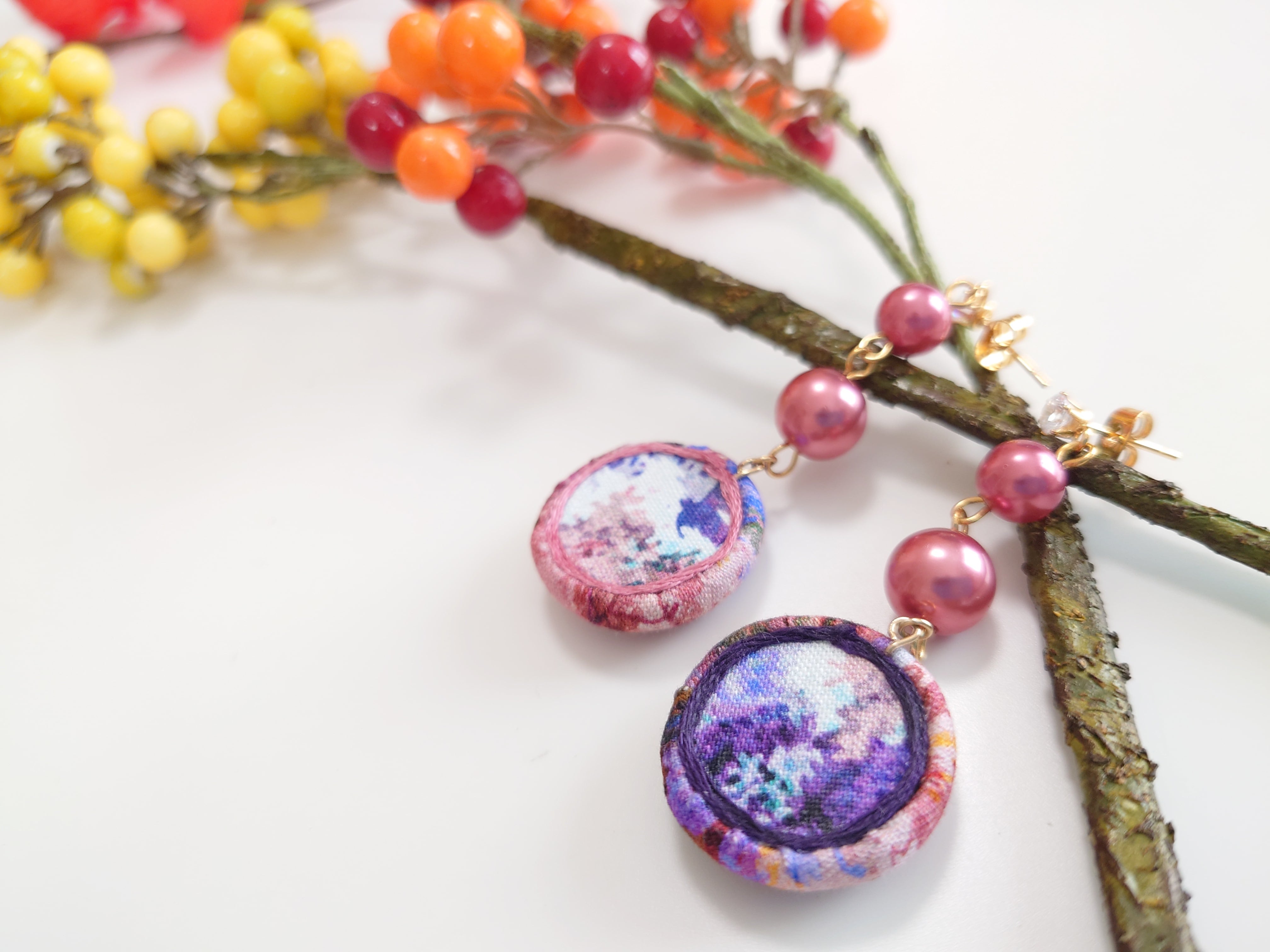 こちらは切り取った部分と似た色のパールビーズを組み合わせて。