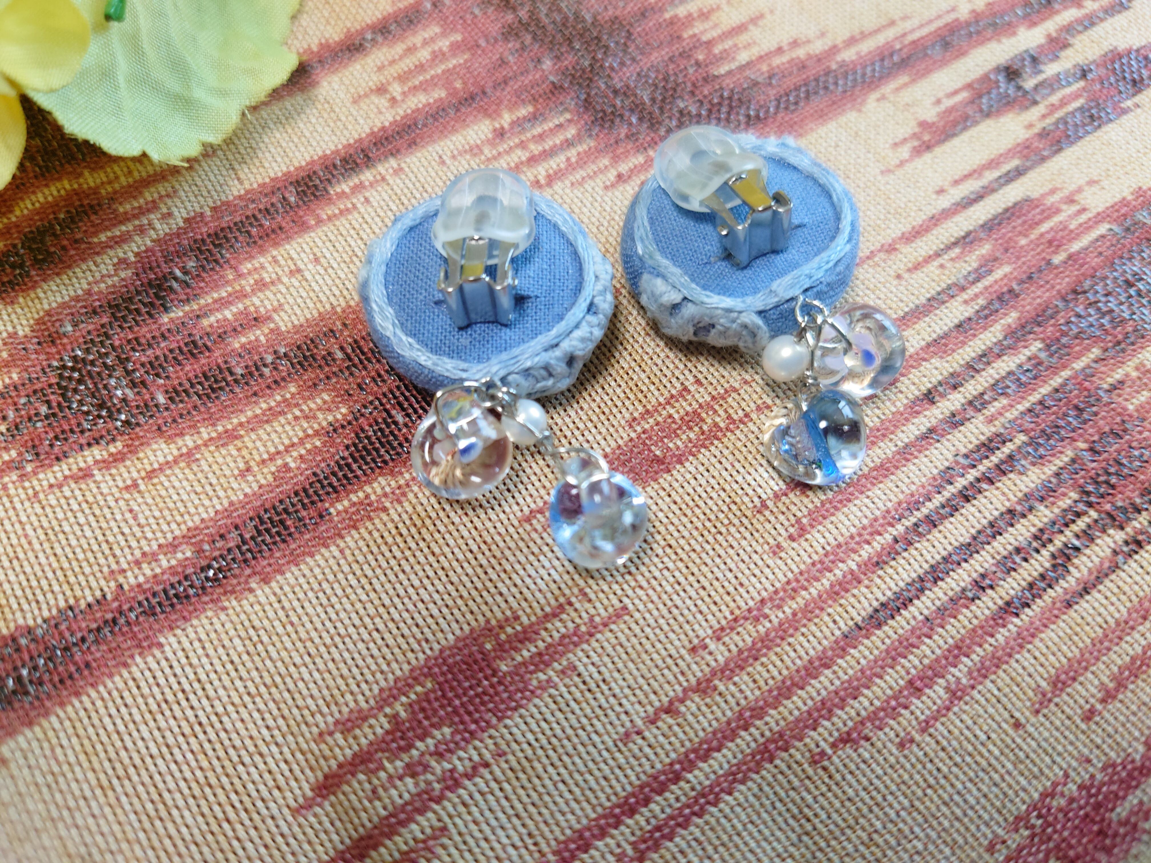こちらのイヤリングは、帯制作時にカットしたレースと木綿の生地を組み合わせてくるみボタンにしました。