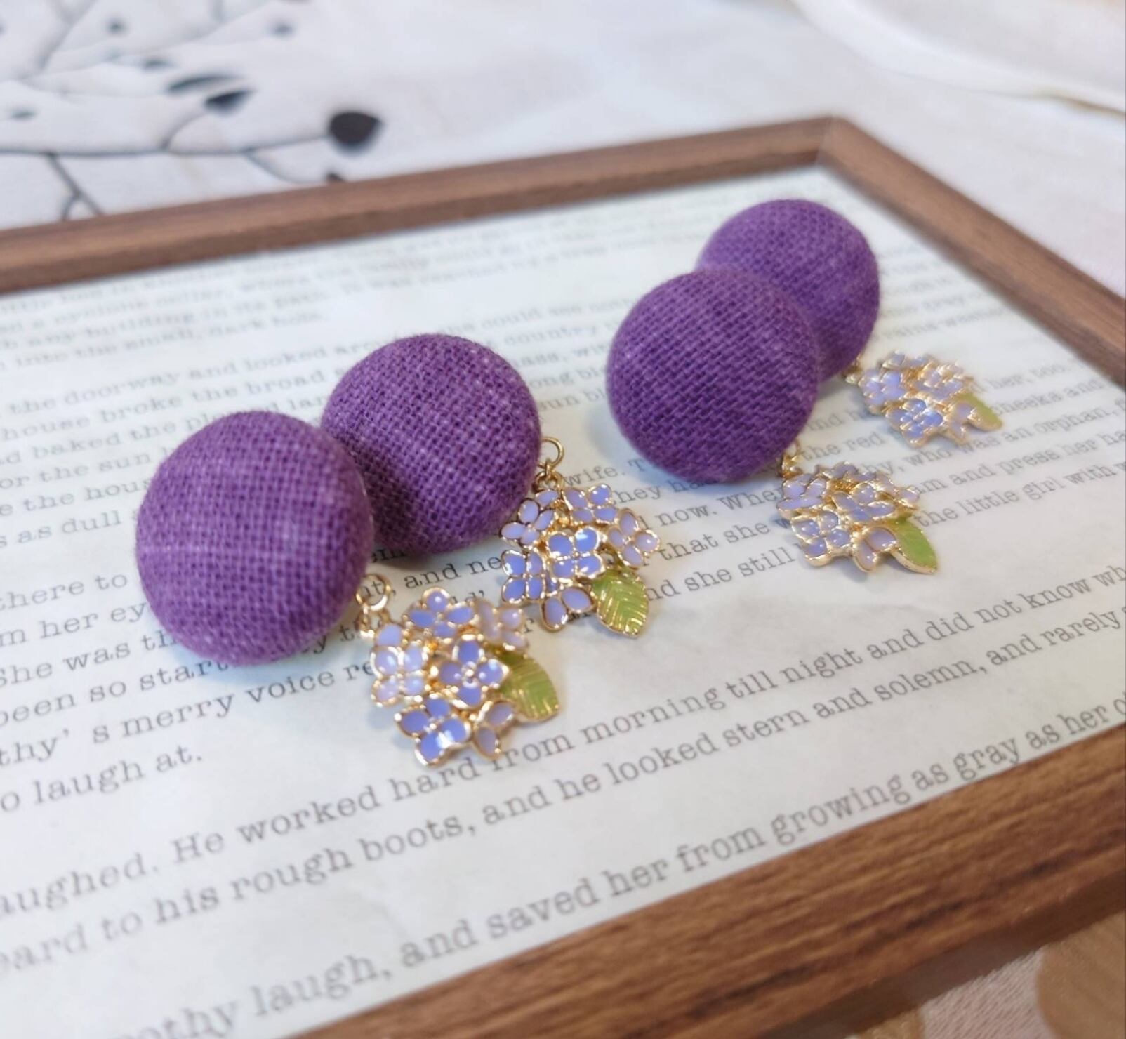手捺染・紫色の生地をくるみボタンにして